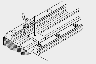 將直線塊規(guī)置于兩支導(dǎo)軌間,使用千分量表校準(zhǔn)直線塊規(guī),使之與基準(zhǔn)側(cè)導(dǎo)軌之側(cè)邊基準(zhǔn)面平行,再依直線塊規(guī)校準(zhǔn)從動(dòng)側(cè)導(dǎo)軌,從導(dǎo)軌的一端開始校準(zhǔn)并依序以特定的扭力鎖緊裝配螺絲。