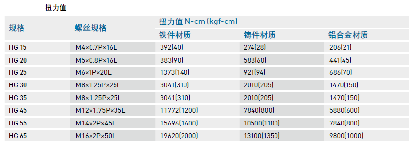 安裝導(dǎo)軌時(shí)是否鎖緊貼平基準(zhǔn)面影響直線導(dǎo)軌精度甚劇,因此為達(dá)到每顆螺絲都能鎖緊的目的,建議使用下列扭力值鎖裝配螺絲。
