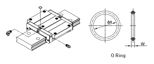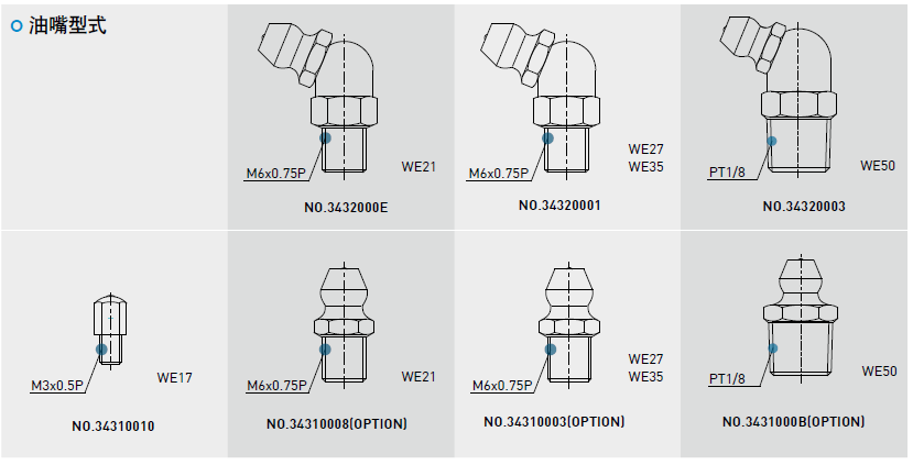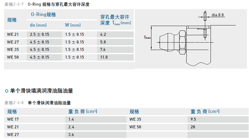 依客戶需要在滑塊前端或后端裝上油嘴以供手動打油,WE系列特別在端蓋側邊預留側油孔位置安裝油嘴(一般為直油嘴),提供側向打油,側向打油的位置建議在非側基準邊,但若有特殊需要亦可放在側基準邊。客戶如有上述側向打油需求請與我們聯(lián)絡。WE系列在端蓋頂端亦預留上油孔位置,客戶若欲從端蓋上方供油,須使用直徑0.8mm的金屬針以預熱的方式,在指定位置將上油孔穿通,再將密封環(huán)安裝于凹處即可,避免使用鉆頭穿通上油孔,碎屑有污染油道的危險。使用接管方式自動供潤滑油脂之直線導軌,則可依連接管型式選用安裝油管接頭。