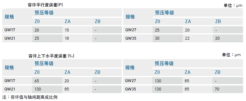 2、安裝平面誤差,直線導(dǎo)軌QW系列為圓弧兩點(diǎn)接觸式直線導(dǎo)軌,其自動(dòng)調(diào)心的特性可以吸收安裝面的些許誤差而不影響直線運(yùn)動(dòng)的順暢性;下表中注明了安裝平面的容許誤差值: